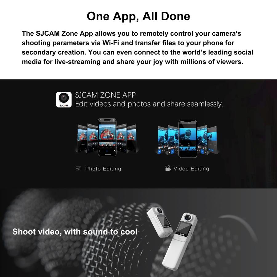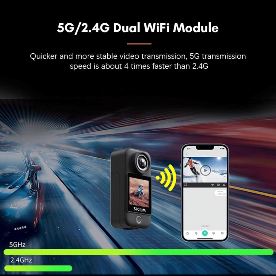 Small body and big features, equipped with 4K high-resolution sensor, SJCAM C300 mini action camera will provide you with more clear pictures. Say goodbye to blur and vignetting. 5G/2.4G dual WiFi module, more stable and quicker transmission.